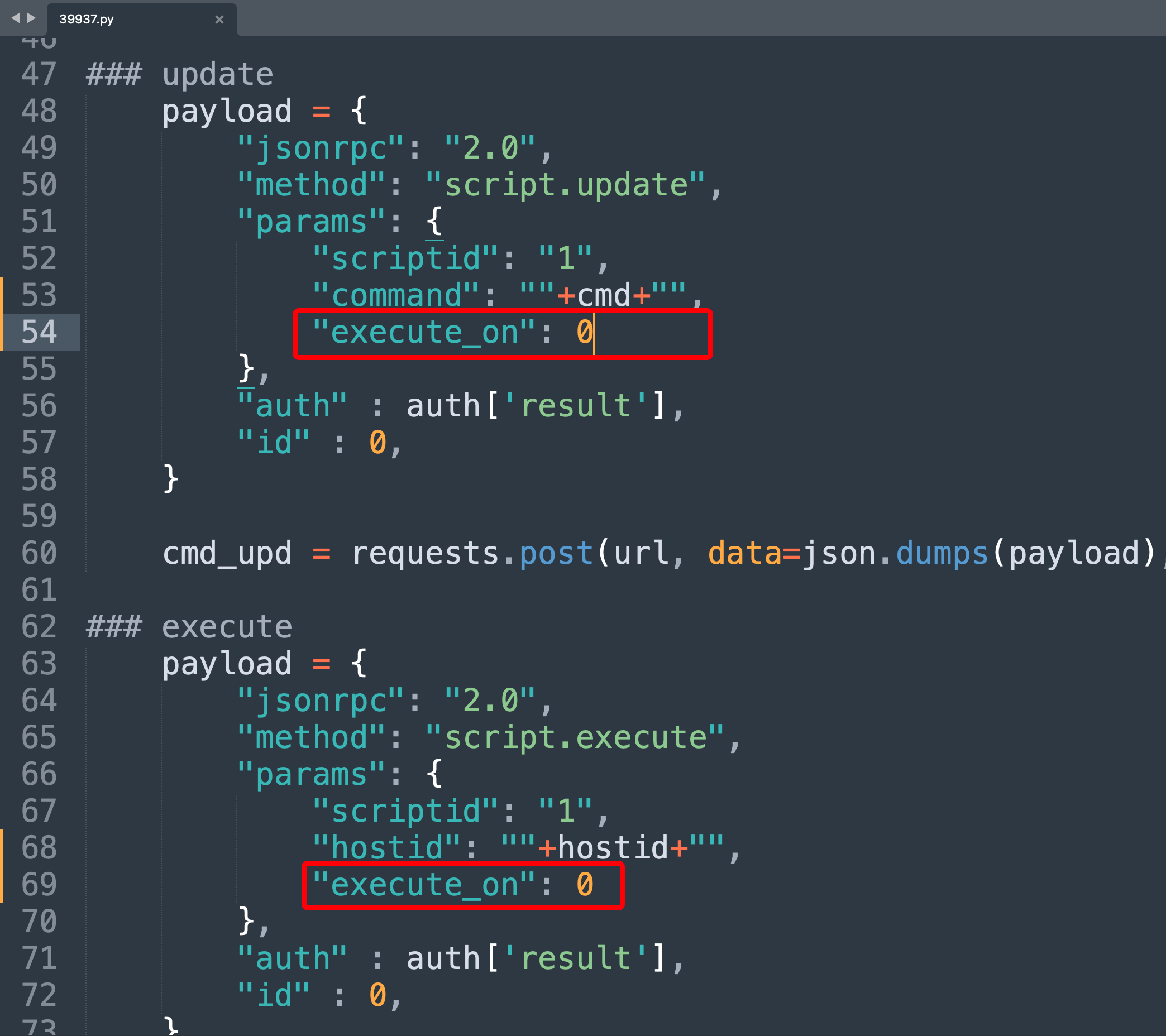 payload = { "jsonrpc": "2.0", "method": "script.update", "params": { "scriptid": "1", "command": ""+cmd+"" }, "auth" : auth['result'], "id" : 0, }