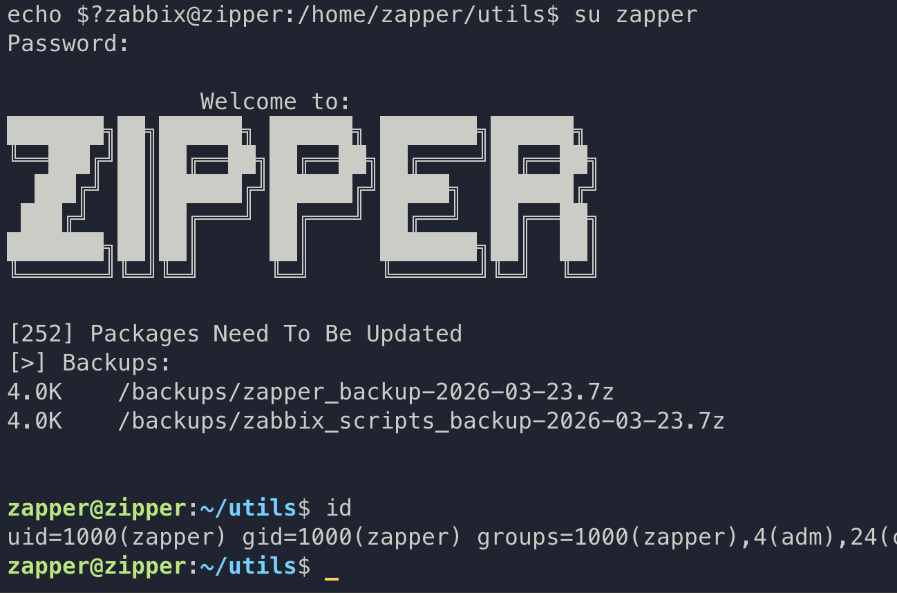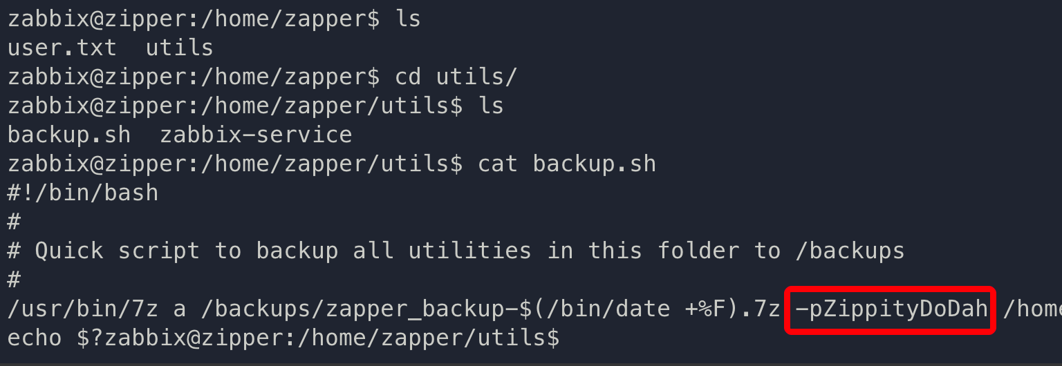 当前 shell 没有权限查看用户旗帜,在 zapper 用户 utils 目录发现备份脚本,脚本中定义了 7z 的压缩密码,复用该密码可切换至 zapper 用户权限。