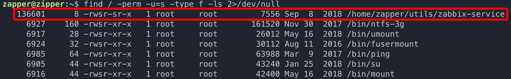 排查系统 suid 程序,发现 /home/zapper/utils/zabbix-service 程序具有 suid 权限,且该程序属于 root 用户。