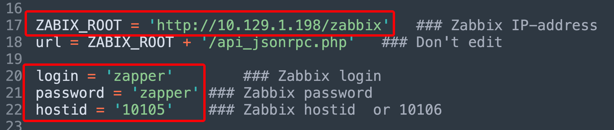 login = 'zapper' password = 'zapper' hostid = '10105'